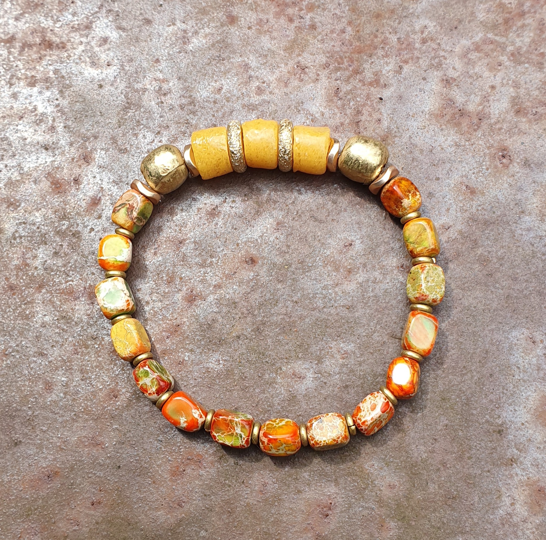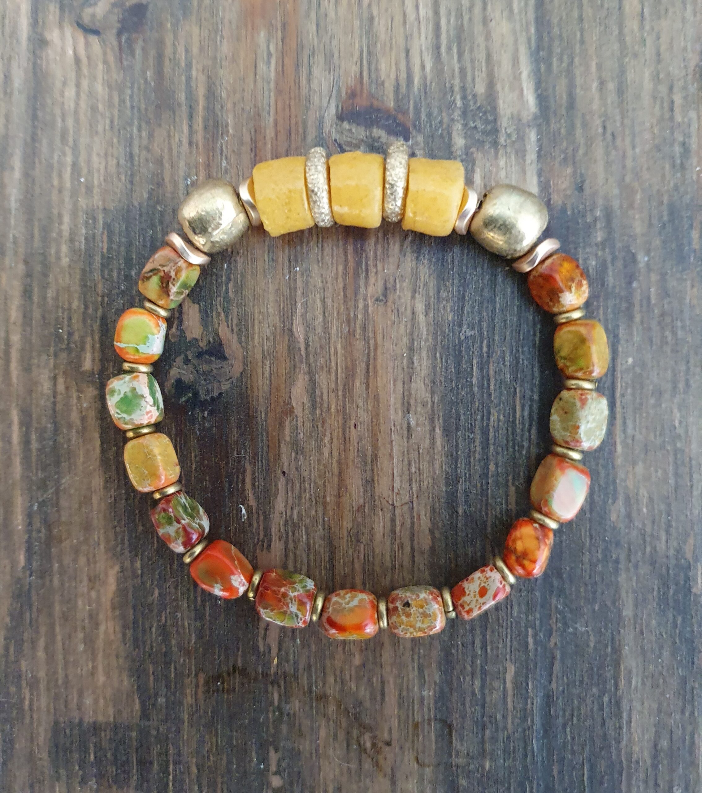 Deze armband, Mello Yellow nummer 3, is gemaakt van Javaanse zeeglas kralen,
