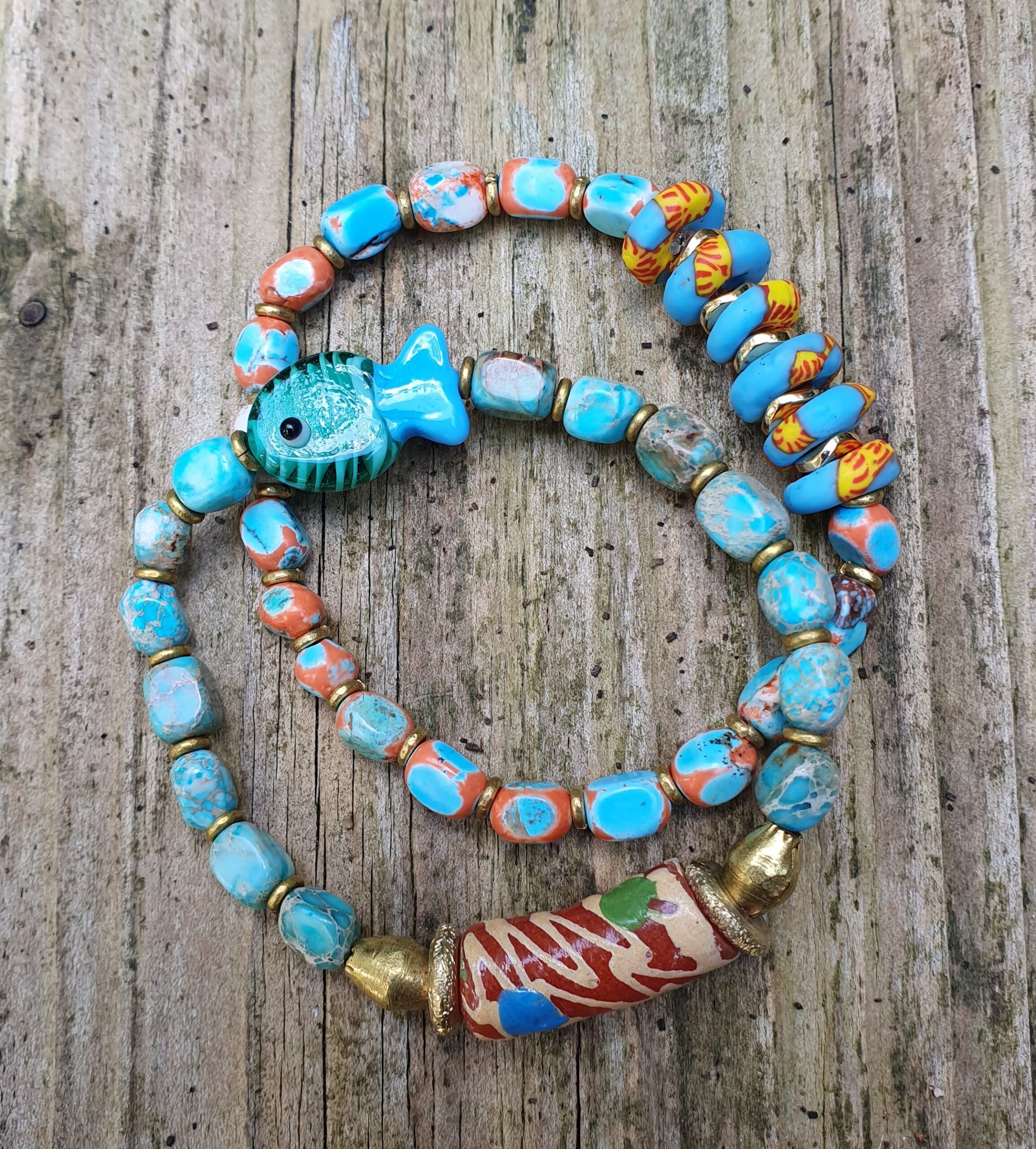 Deze armband, MM Sky Blue armband 6, heeft een klein keramisch visje,