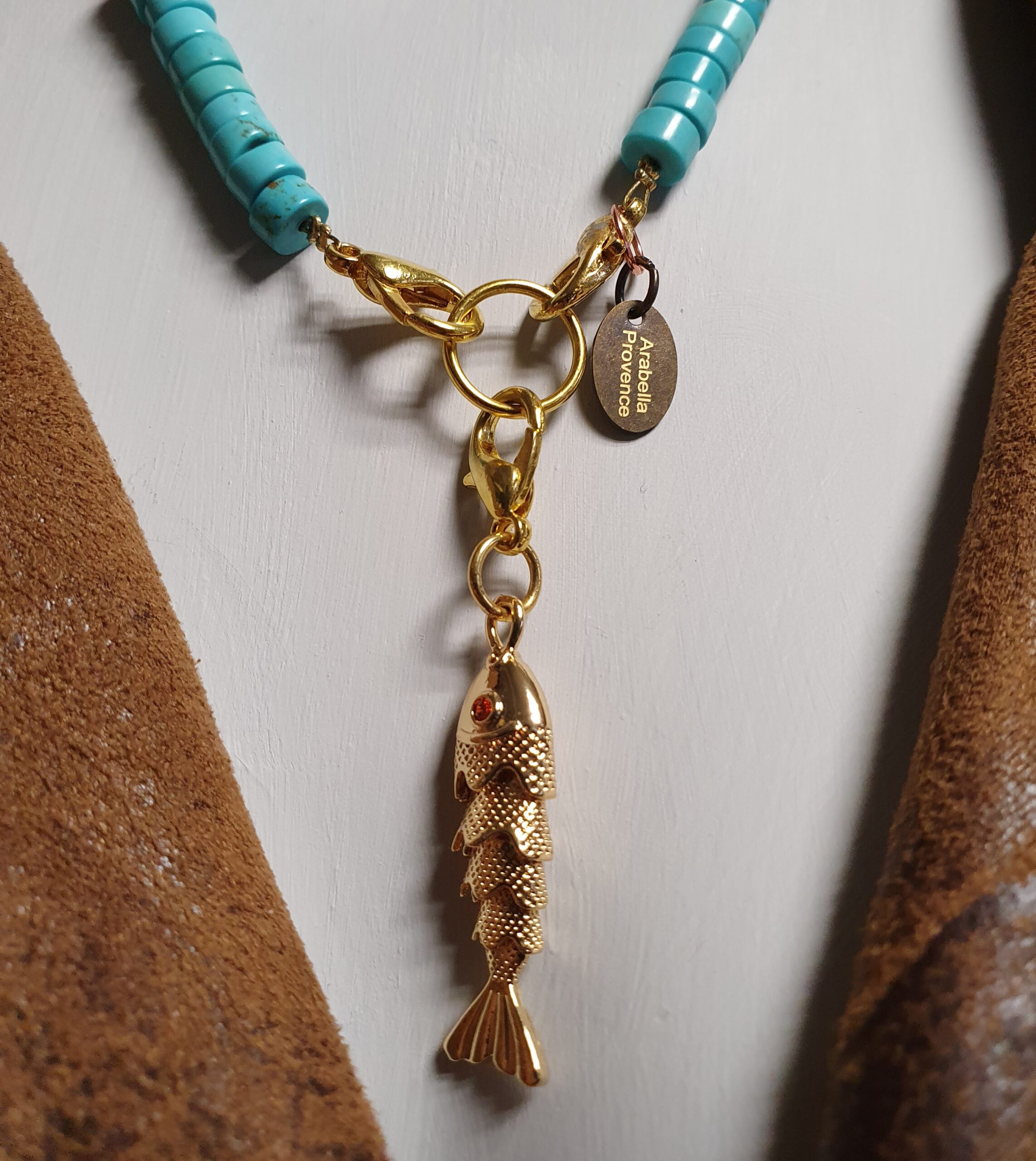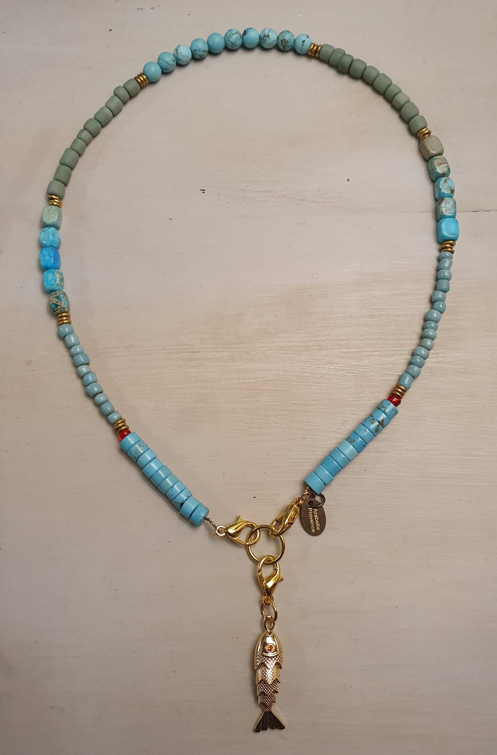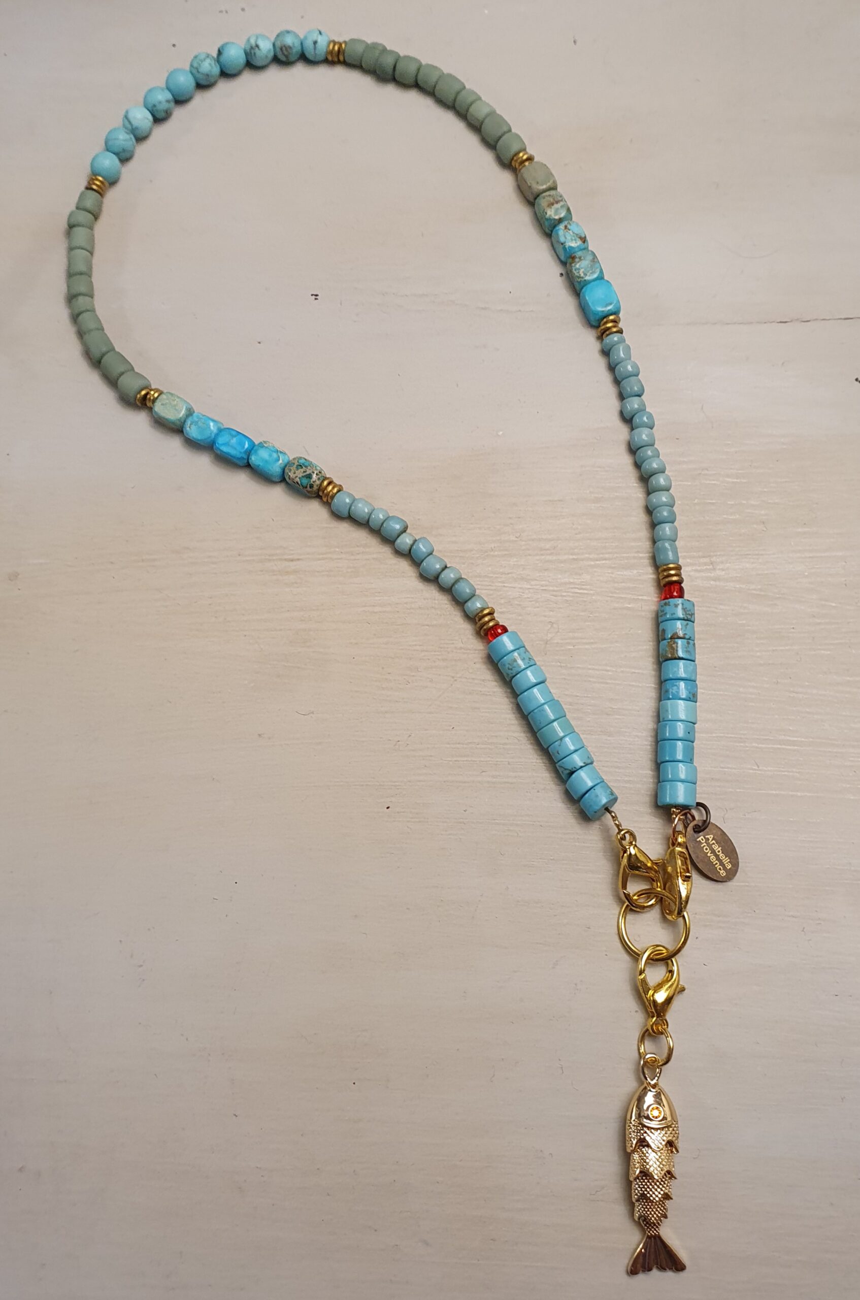 natuurstenen kralen, pistach groene Javaanse glaskralen, beweegbaar goudkleurig  visje,